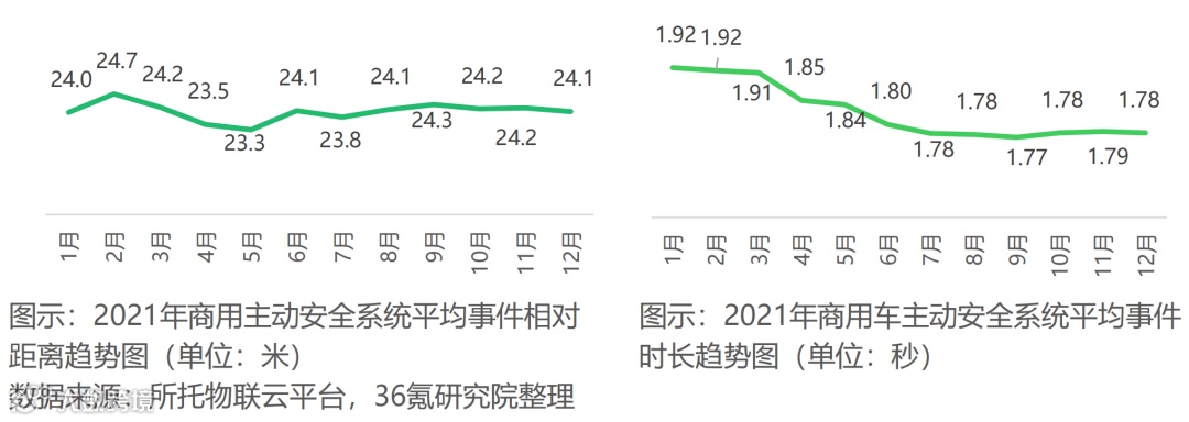 事实上,“主动安全”在降低事故发生率方面确实效果显著。据AXA Winterthur统计数据显示,高级辅助驾驶系统(ADAS)可以避免 43.4% 的交通事故。而据36氪研究院最新的《2022商用车道路运输安全研究报告》分析,在预警策略保持稳定的情况下,主动安全系统可以在司机未识别风险时及时启动缓速或制动,从根源上减少人员伤亡和经济损失。同时主动安全系统将平均事件时长(设备预警开始至司机干预驾驶为止的时间)由1.92s降至1.78s,说明司机的安全防范意识越来越强,从而能够在更短的时间内响应设备预警或采取制动措施,主动化解风险。
