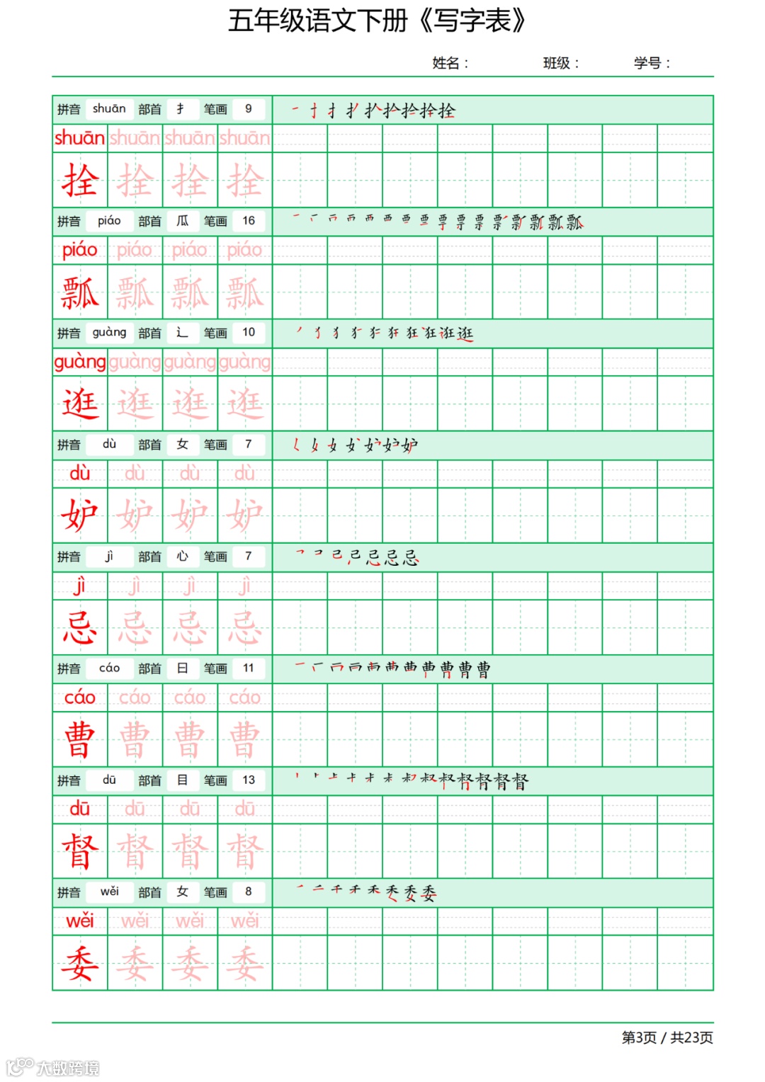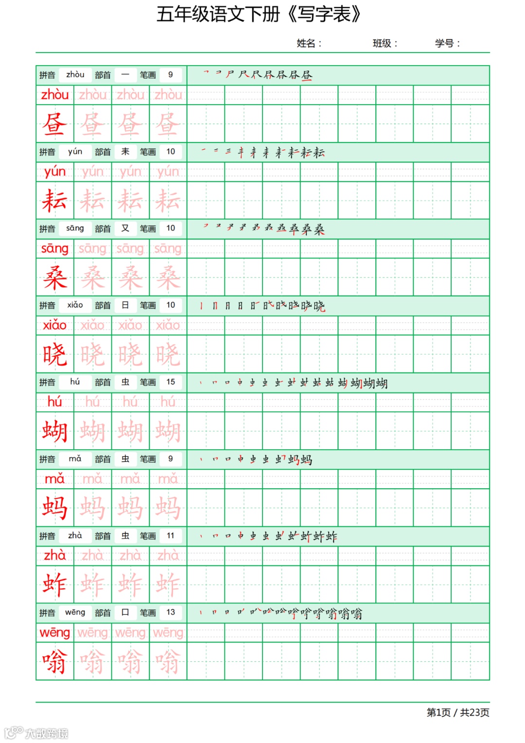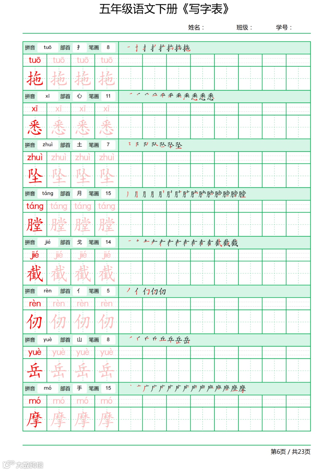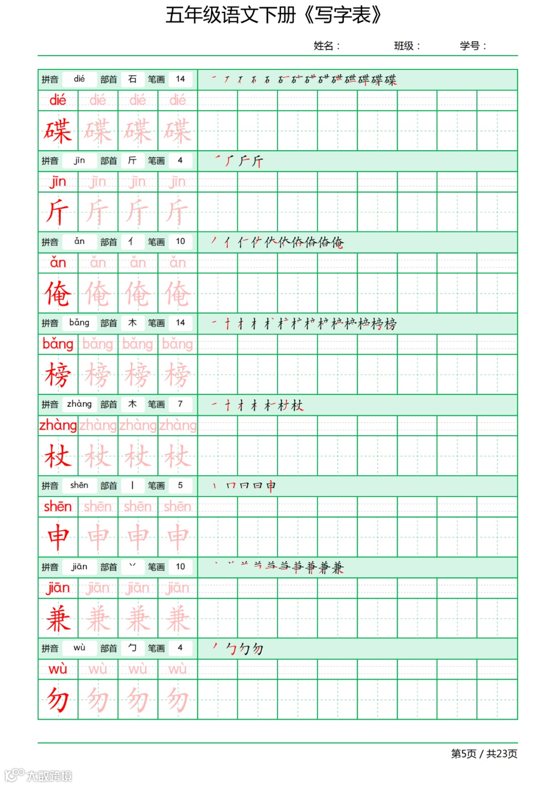 五年级语文下册:写字表《田字格字帖》(拼音、部首、笔顺、笔画),可下载
