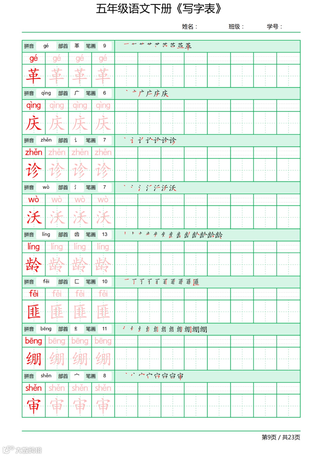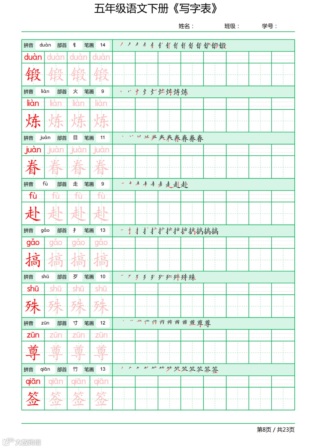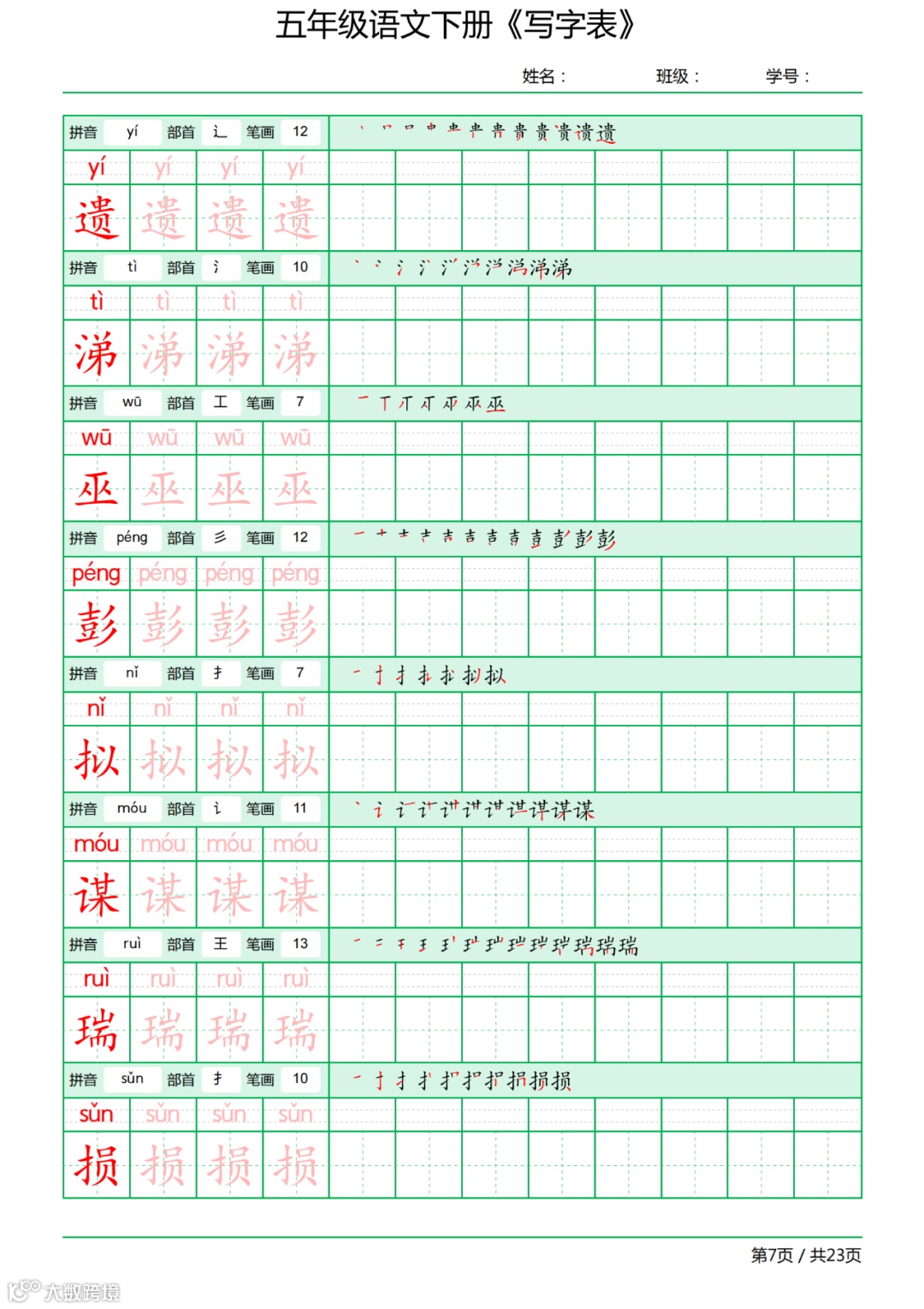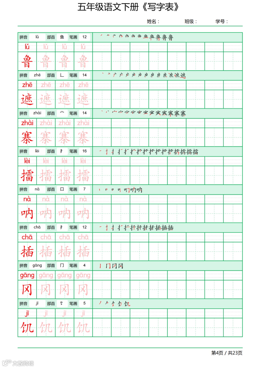 五年级语文下册:写字表《田字格字帖》(拼音、部首、笔顺、笔画),可下载