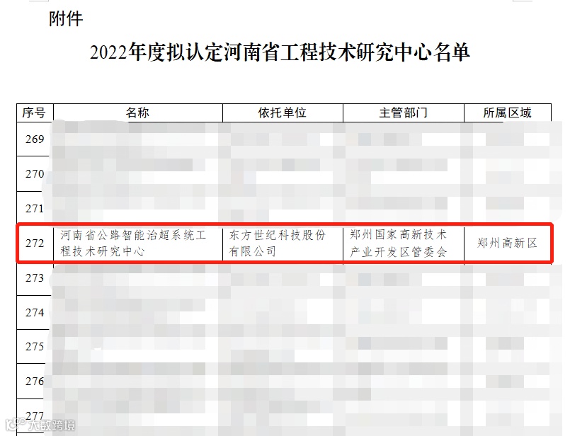 近日,河南省科技厅公示了2022年度河南省工程技术研究中心名单,我司位列其中,被认定为“河南省公路智能治超系统工程技术研究中心”,标志着我司的研发平台建设和产业创新能力日益完善。