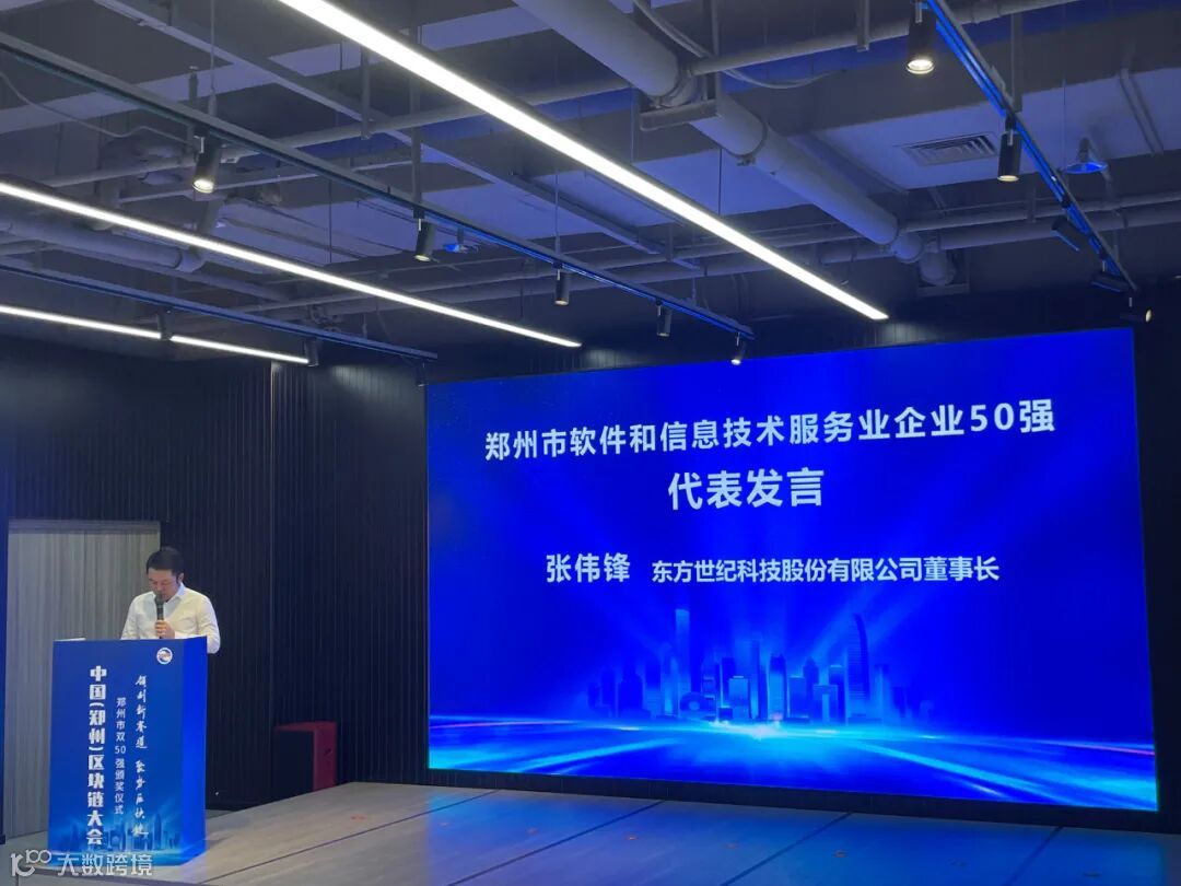 此次大会的主题是“领创新赛道 聚势区块链”,在会议中郑州市工信局二级调研员马全志为大会致辞,由郑州市工信局电子信息产业办宣贯了电子信息相关政策,郑州市工信局信息化处宣贯了软件和信息技术服务业相关政策,郑州市工信局两化融合处宣贯了郑州市两化融合相关政策等。在郑州市电子信息、软件“双50强”颁奖仪式阶段,东方世纪作为“双50强”企业代表做了发言。
