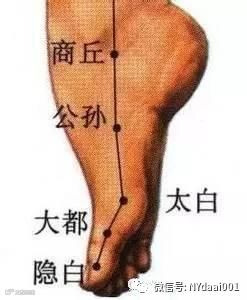 【太白穴】该穴位可以保卫我们的脾经,祛除湿邪,就像太白金星似的,所以取类比象,就将它命名为太白穴。太白穴也在足底,在足内侧缘,当足大趾本节(第1跖趾关节)后下方赤白肉际凹陷处。按摩太白穴的方法和按摩隐白穴一样。当然,用艾灸仪温和施灸,更加方便,效果也更好。