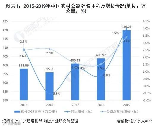 2015-2019年,我国农村公路建设里程整体呈现增长态势。截至2019年末,我国农村公路里程达到420.05万公里,较2018年增长4.0%,近几年增长率首次超过公路建设总里程增长率,高出0.6个百分点。