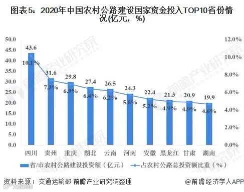 分区域情况来看,2020年度四川省农村公路建设国有投资最大,达到43.6亿元,占全国农村公路国家总投资比重为10.1%,其次是贵州省31.6亿元和重庆市的29.8亿元,整体来看国家农村公路建设国家投资以中西部地区为主。