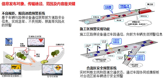 这些固定点,到高速公路里面合流区、分流区、施工区,也都是一些典型的预警地方,这些预警地方,通讯的方案怎么设计,谁告诉谁信息,数据流谁传递给谁,内容应该传递什么样的消息,在什么时间点传递,传递的阈值什么样,这也需要后台精准的设计。这是原来做的一些东西。