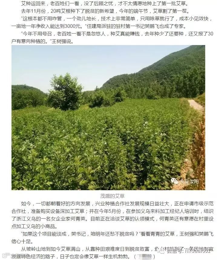 盛夏行走在中原大地,扶贫产业热火朝天,处处涌动着发展的热潮,广大贫困群众受益其中。南阳大艾艾草种植项目把产业扶贫作为作为推进精准扶贫、提升脱贫“造血”功能的一剂“猛药”,大力培植富民产业,具有可持续性和可复制性的新路径。下面就看看如今与我们合作的合作社与农户们的发展状况吧。