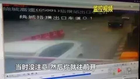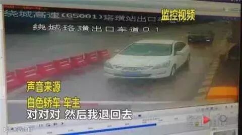 因入站时候车速过快,ETC没有感应到,栏杆没有抬起来,白色轿车只能倒回去再次进行识别。