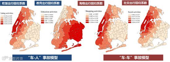 交通事故与浮动车的出行记录在空间和时间上都存在显著的相关性,我们把一系列的数据都放到我们空间模型中,去分析交通小区种不同出行的活动类型对事故风险的影响。比如吃饭、教育等这些出行活动和机非机动车的交通事故风险呈正相关,关键可以在不同小区中给出吃饭、教育等等出行模式对交通事故风险、机非交通事故风险的定量化的刻画。在购物、社交出行和机-机等交通风险正相关,而且可以给出不同的交通小区之间它的影响强度。