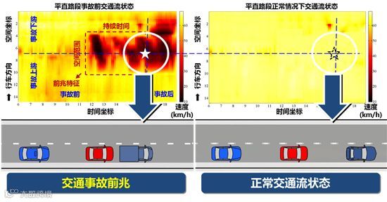 传统交通安全的分析运用静态手段分析交通事故,但是在大数据的环境下,应动态的高解析度动态交通流数据去分析交通事故和事故风险之间的关系。我们提取了沪杭甬等等高速公路1万余起交通事故,对每一起交通事故,我们研究在事故发生前大概30分钟之内的上下游相邻路段,与它的高解析度动态交通流数据和同样位置正常情况下的交通流数据进行对比。