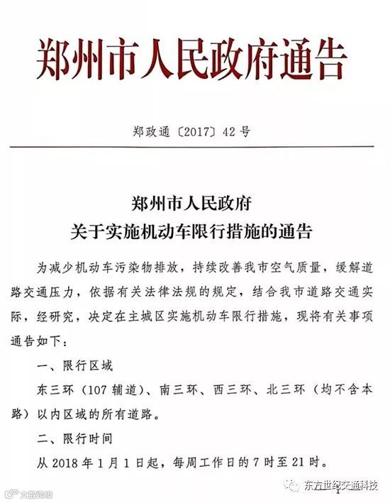 为减少机动车污染物排放,持续改善郑州市空气质量,缓解道路交通压力,依据有关法律法规的规定,结合郑州市道路交通实际,经研究,决定在主城区实施机动车限行措施,现将有关事项通告如下: