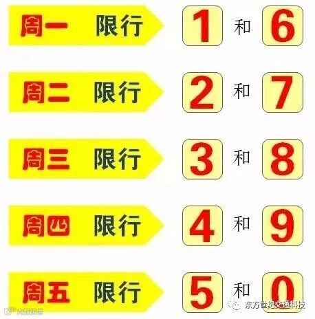 (一)按机动车号牌(含临时号牌和外地号牌)最后一位阿拉伯数字(尾数为字母的,以末位数字为准),工作日每天限行两个号。