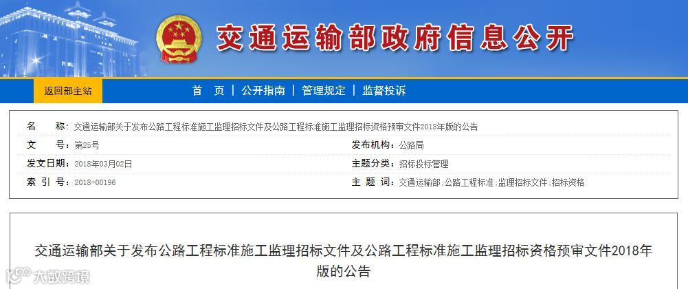 另悉,《公路工程标准施工监理招标文件》(2018年版)及《公路工程标准施工监理招标资格预审文件》(2018年版)将于2018年5月1日起施行。