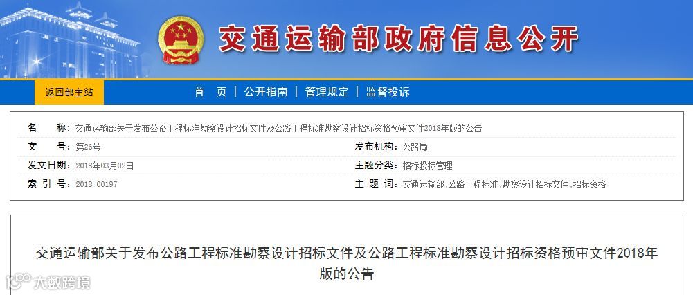 从交通运输部获悉,《公路工程标准勘察设计招标文件》(2018年版)及《公路工程标准勘察设计招标资格预审文件》(2018年版)将于2018年5月1日起施行。