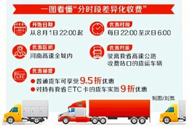 令人欣慰的是,没有列为试点的河南省,却成了全国第一个实施这个举措的省份:从今年8月1日起,无论是河南籍的货车还是途经河南省的货车,每天22时至次日6时期间,驶离河南省高速公路收费站口的货运车辆,通行费实施9.5折优惠,对持有河南省ETC卡的货车实施9折优惠。(后来又有报道称,只要夜间驶离河南高速公路任一收费站口,在河南高速全域内均享受最高9折优惠政策。)