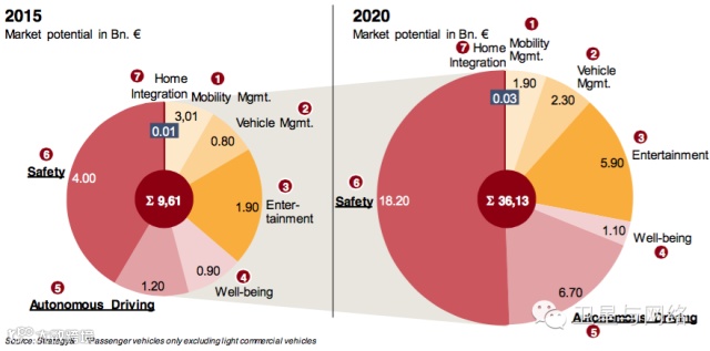 个人健康和安全相关的应用,现在最常见的比如疲劳驾驶提醒与事故的应急处理等。这一块到2020年估值是10亿欧元左右,我们认为到2030年会进一步增长,为什么这么说呢?