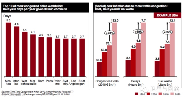 右图讲的是交通拥堵给城市带来的额外的浪费,交通拥堵成本。美国市场的数据是2010年因为交通拥堵给社会造成的浪费是760亿欧元,到2020年会进一步增加73%。这个数据如果应用到中国,中国有六百多个城市,给社会带来的交通拥堵的成本应该是非常非常大的,这一点我相信也是中央、地方政府、车企、消费者共同感到有压力和有需求的地方。