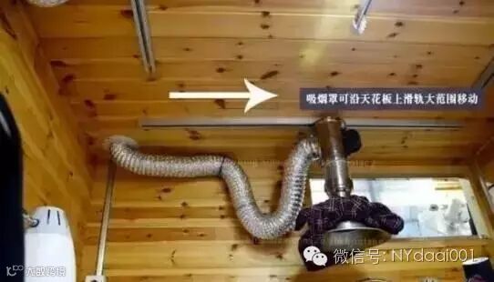 他们的排烟方法源自韩式烤肉排烟,效果很好。在对应床的房屋天花板安装一根滑道,整个排烟器手推拉沿滑道滑行道,这样排烟口调整就从头覆盖到脚。