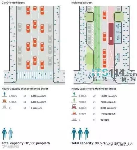 ▲图六:左边为小汽车导向道路,右边为多模式道路,下面列出每小时的通行量。来源:NACTO 全球道路设计指南Global Street Design Guide