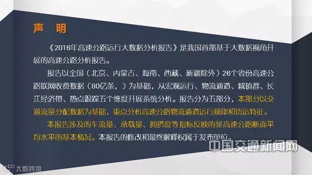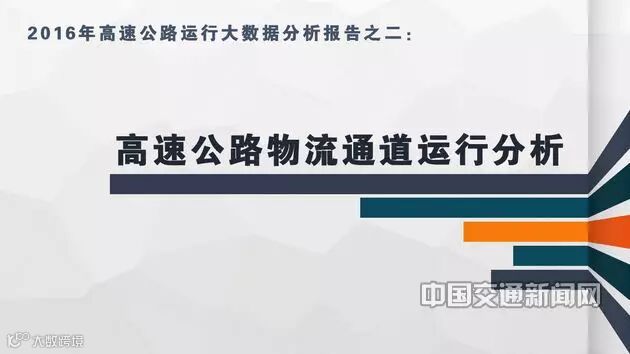 交通运输部科学研究院、综合交通大数据应用中心起草的《2016年中国高速公路运行大数据分析报告》系列二:高速公路物流通道运行分析,以(北京、内蒙古、海南、西藏、新疆除外)26个省份高速公路联网收费数据(80亿条)为基础,通过流量分配等技术处理,系统诠释高速公路物流通道运行规律和货运特征,揭开物流通道运行效率、运输动态和服务水平。