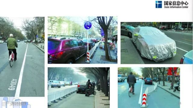 这是朝阳区一些路边停车的例子,这种停车是要跟规范管理相结合的。图上到处都是违法停车,我们倡导绿色出行,可老百姓因为这些原因只能在机动车道上骑自行车,这是非常危险的。