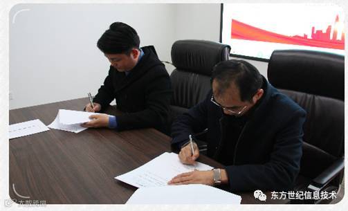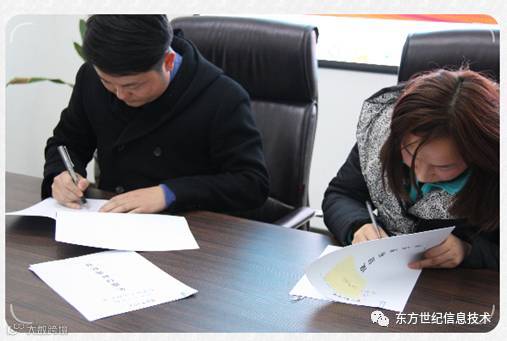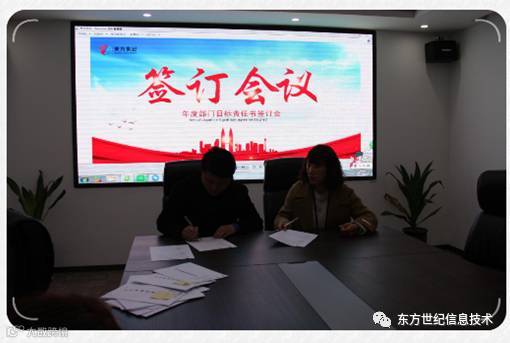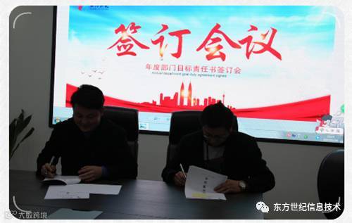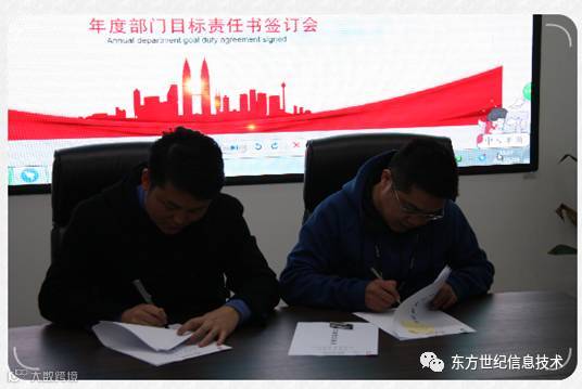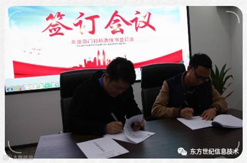 2017年初,河南东方世纪信息技术有限公司年度目标责任书签订仪式在公司总部会议室顺利举行。签订仪式由总经理助理冯卫杰先生主持,总经理张伟锋先生动员讲话,公司各部门中高层管理人员参加了签订仪式。