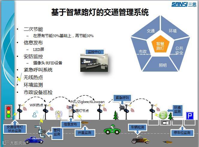 这样一来,刚才提到虚线的部分,智慧路灯跟智能交通有一个非常大的交集,里面信息采集、处理以及发布,有相当一部分可以整合在一起,或者互相利用。同时有智慧路灯集成也可以延伸出一些新的功能。我把智慧路灯和智能交通结合在一起,也代表了在智能交通里面把智慧路灯作为非常重要的节点加以应用。