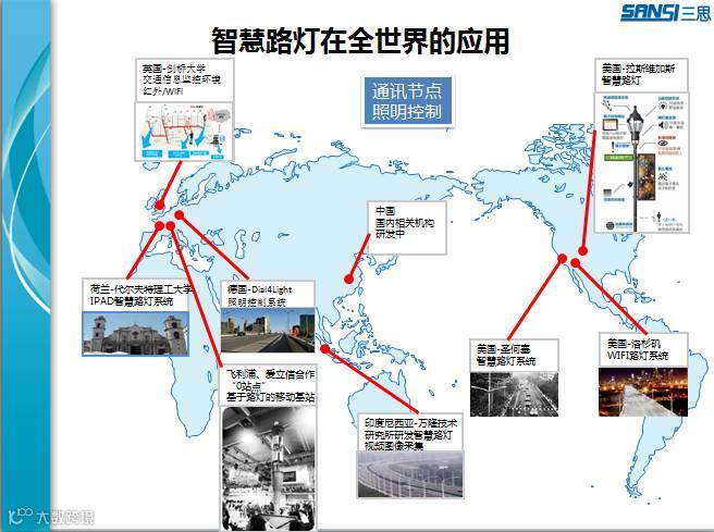 智慧路灯在全世界如火如荼展开安装和应用,其中英国剑桥大学正在试图路灯的灯柱做交通信息监控环境红外,WIFI、的研究和使用。在中国洪泽、杭州和北京做了智慧路灯的研究