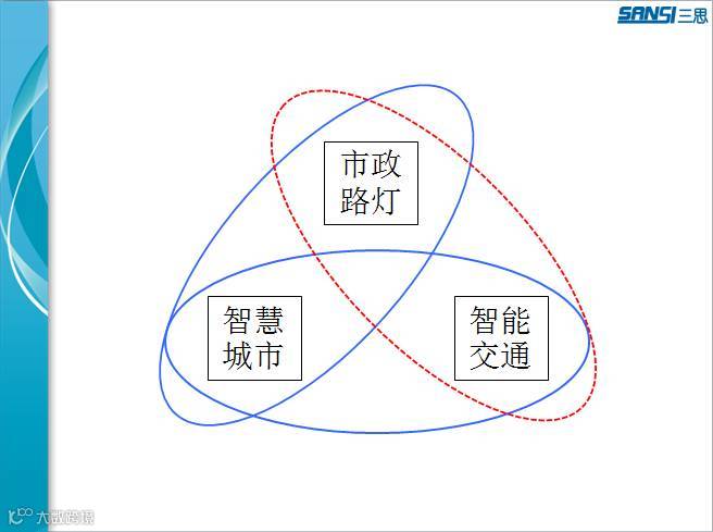 三者的关系我们看一下,智慧城市包含了智能交通,智能交通是智慧城市其中一个非常重要的功能模块,市政路灯对与智慧城市已经有了结合。市政路灯怎么样跟智能交通结合,现在这个结合还没有发生,但是我们认为这个也可以很好的结合。