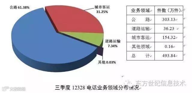 从业务领域看,第三季度,12328电话业务量主要集中在公路、道路运输、城市客运领域,涉及水路、海事、海上搜救、救助打捞等领域的电话业务量仅占业务总量的0.03%。