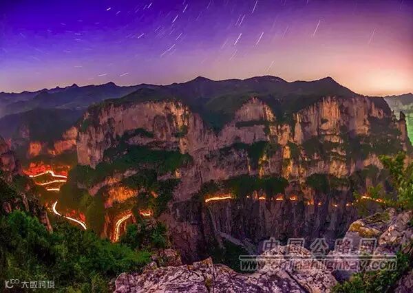 图片说明:在河南省林州大峡谷,夜空中的繁星与地上奔驰的车辆遥相呼应,组成一幅美丽的画卷。