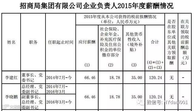 其中,招商局集团有限公司董事长、党委书记李建红和总经理、党委副书记李晓鹏,均为120.24万元的税前薪酬,是2015年度央企负责人税前薪酬收入最高的2位。