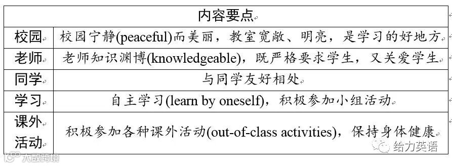 【名师赏析】本文的亮点之处有:1.要点齐全,内容完整,层次分明;2.第二段重点介绍高中生活时,以“我”的口吻统一叙述,使得“校园”“老师”“同学”“学习”“课外活动”几个方面的信息衔接自然,过渡流畅;3.相关短语的运用,如be strict with,care for,get along well with,take an active part in等,体现了作者扎实的语言功底;4.with介词短语和感叹句的运用,使得文章富有灵动性。