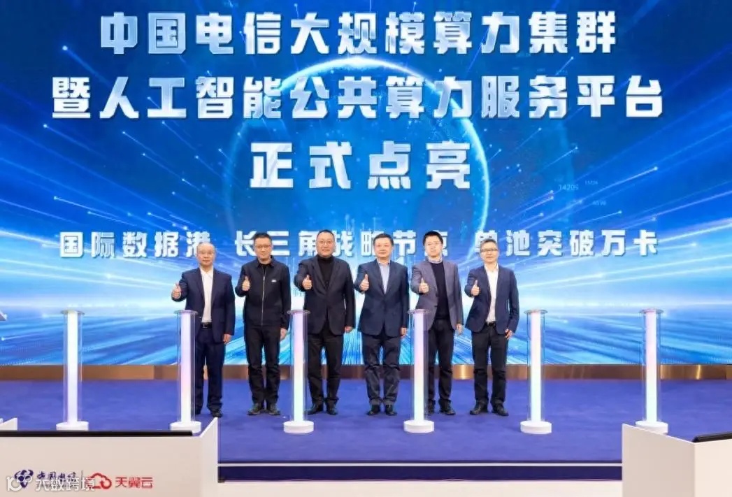 上海市徐汇区委书记曹立强,上海电信党委书记、总经理龚勃,上海市经济和信息化委员会副主任张宏韬,上海市科学技术委员会副主任屈炜,上海市通信管理局副局长戴斌,天翼云科技有限公司副总经理曾卫民,共同启动 “中国电信大规模算力集群暨人工智能公共算力服务平台”