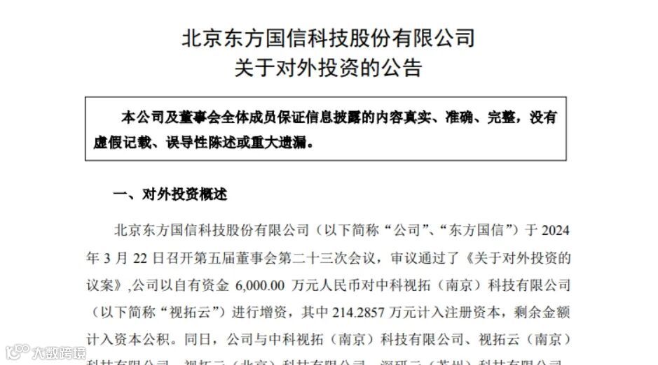 东方国信以自有资金6000万元对中科视拓(南京)科技有限公司(简称“视拓云”)进行增资,其中214.2857万元计入注册资本,剩余金额计入资本公积。