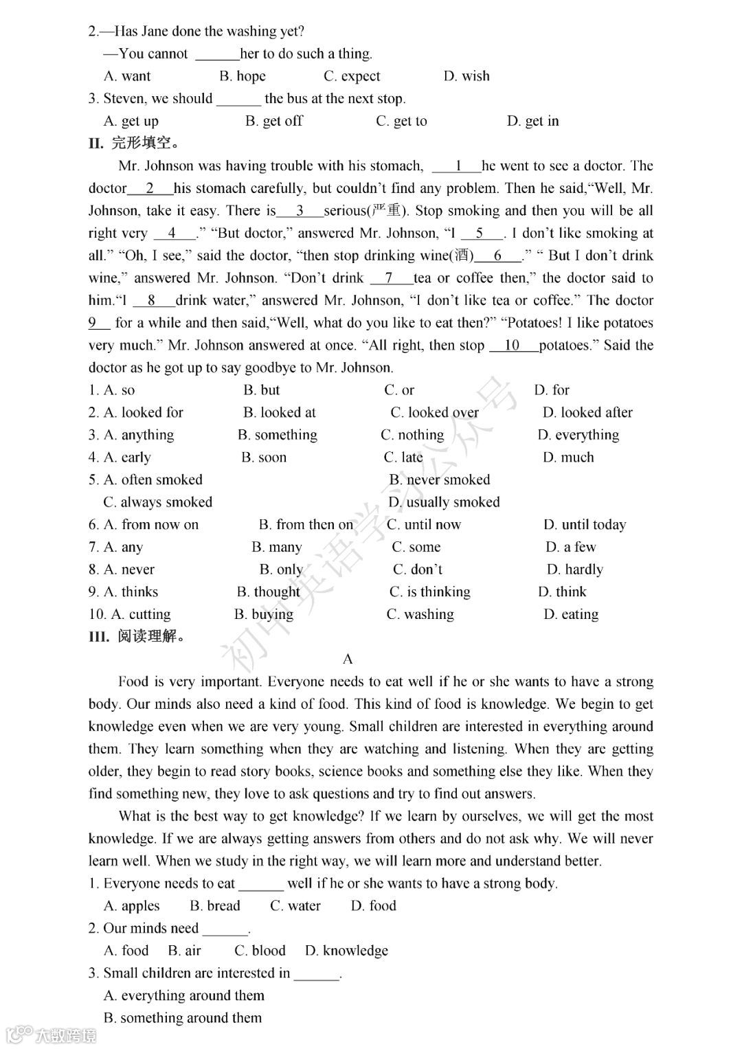 2. C。look for“寻找”;look at“看”;look over “仔细检查”;look after “照顾”,故选C。含义: 医生仔细检查了他的胃。