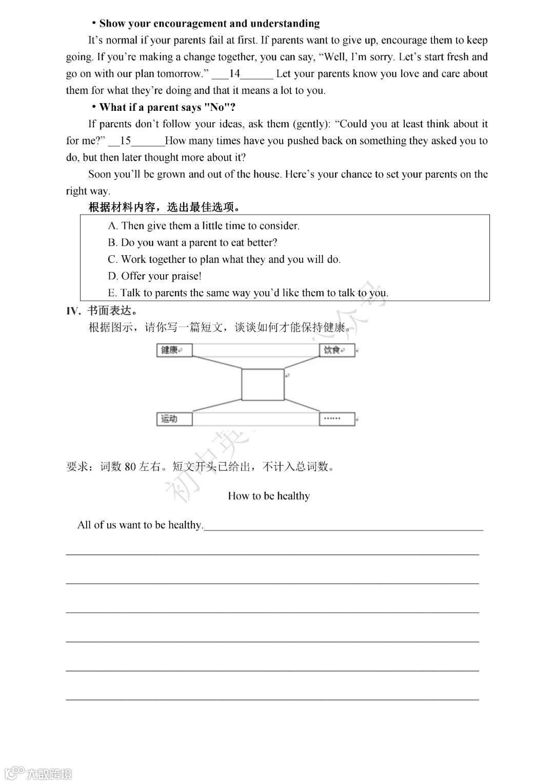 First, sleeping is important. Weneed about eight hours’ sleep every night. If you don’t have enough sleep, youwill be sleepy. Second, a healthy diet is also important. Fresh vegetables andfruit are good for us. Besides, everyone needs to do some exercise to keep fit,such as swimming, running and playing ball games.