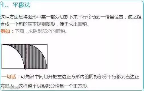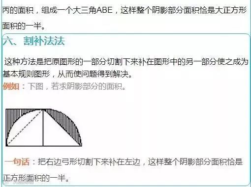 割补法,是学生拥有比较强的转化能力后才能轻松运用的,否则学生看到这样的题目还是会无从下手。尤其适用于直接求面积较复杂或无法计算时,通过对图形的平移、旋转、割补等,为利用公式法或和差法求解创造条件。