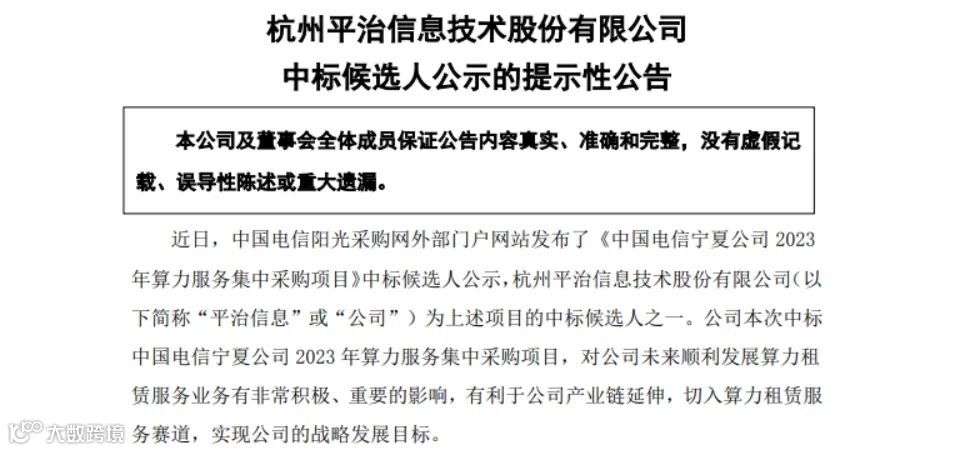 近日,平治信息表示,为中国电信宁夏公司2023年算力服务集中采购项目的标段2的第一中标候选人,根据招标文件显示,本次项目标段2的第一中标候选人招标预估不含税金额为1.5亿元。