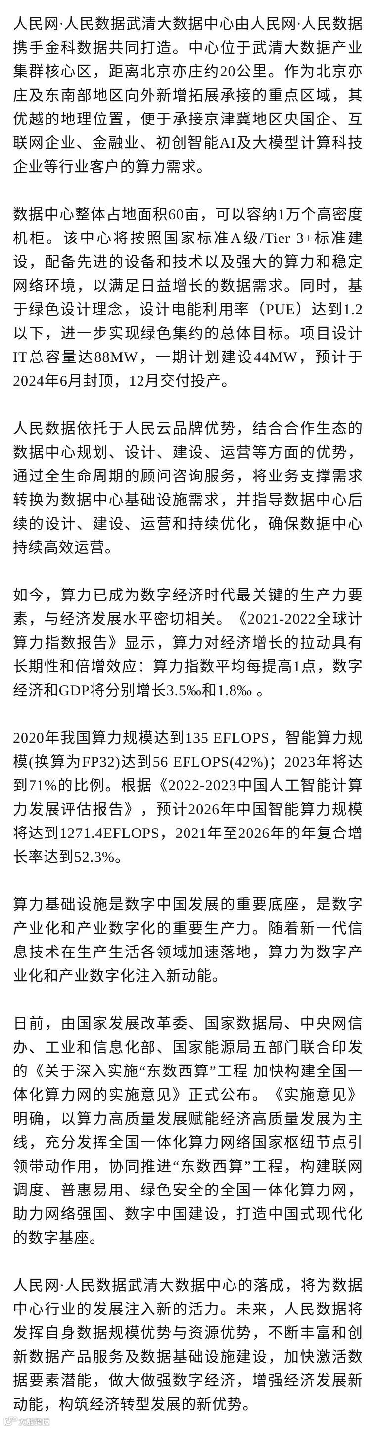 近日,人民网·人民数据武清大数据中心正式提供算力预售服务。人民网·人民数据武清大数据中心,作为“人民系”又一个数字基础设施项目,致力于安全高效为各行业提供数据存储、处理、分析和应用等全方位服务,为算力支撑经济高质量发展作出新贡献。