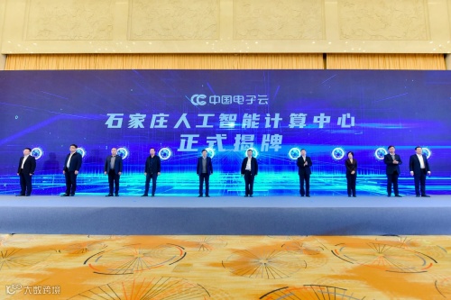 河北省工信厅副厅长宋向党,石家庄市投资促进局局长赵勇,市科技局党组成员、副局长逯岩辉,市数据资源管理局副局长于惠,市工信局党组成员、总工程师赵建明,国投集团总经理袁晓磊,交投集团总经理赵付安,鹿泉区委副书记、河北鹿泉经济开发区党工委副书记、管委会常务副主任赵军会,桑达股份副总裁崔朝蓬,中国电子云助理总裁胡超共同为“石家庄人工智能计算中心”揭牌。