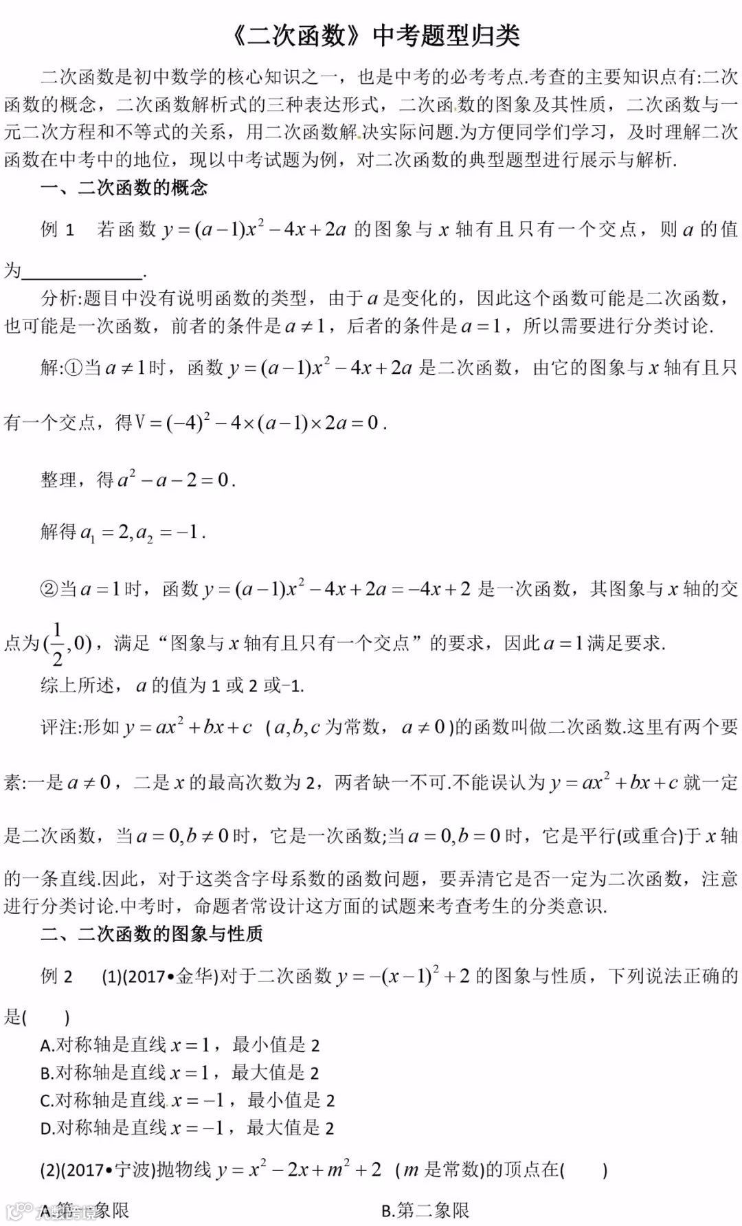 导读:第一部分 知识点总结第二部分 学习口诀二次函数图像与性质口诀二次函数抛物线,图象对称是关键;开口、顶点和交