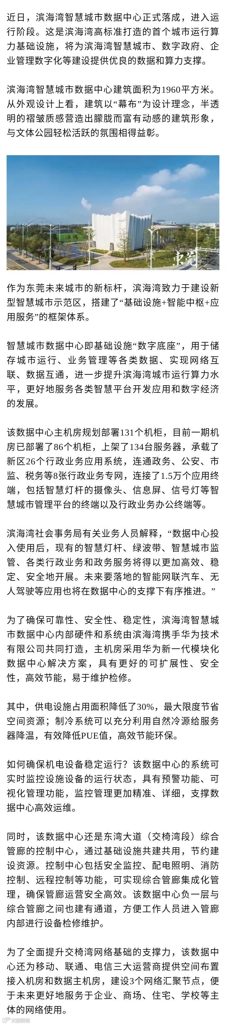东莞滨海湾智慧城市数据中心正式落成,并为三大运营商提供空间布置接入机房和数据主机房