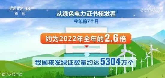 从绿色电力证书核发看,今年前7个月,我国核发绿证数量约达5304万个,约为2022年全年的2.6倍,截至7月底,全国共累计核发绿证超过1.2亿个。