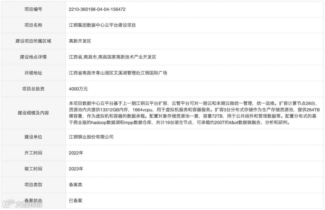 近日,江西省投资项目在线审批监管平台发布《江铜集团数据中心云平台建设项目》公示,项目总投资为4000万元。