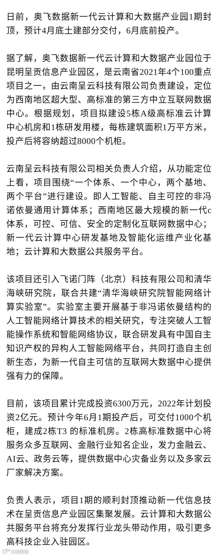 奥飞数据新一代云计算和大数据产业园1期封顶,预计4月底土建部分交付,6月底前投产。