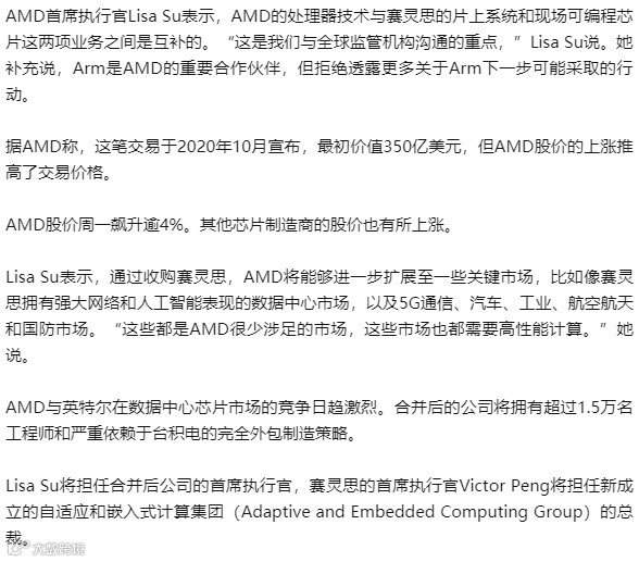 AMD表示,已完成对赛灵思的收购,这笔交易价值约500亿美元,创下芯片行业交易历史记录,交易将使AMD能够在关键的数据中心市场获得额外优势。