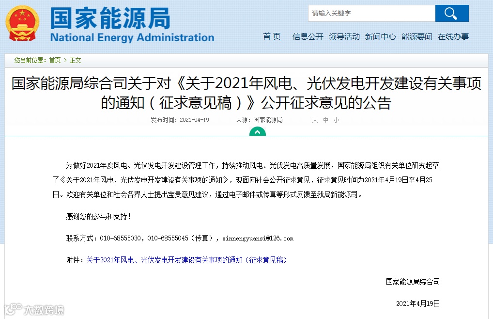 4月19日,国家能源局综合司发布《关于2021年风电、光伏发电开发建设有关事项的通知(征求意见稿)》,与之前版本相比,《意见稿》首次提出风电、光伏发电量占比到2025年达16.5%左右的目标。