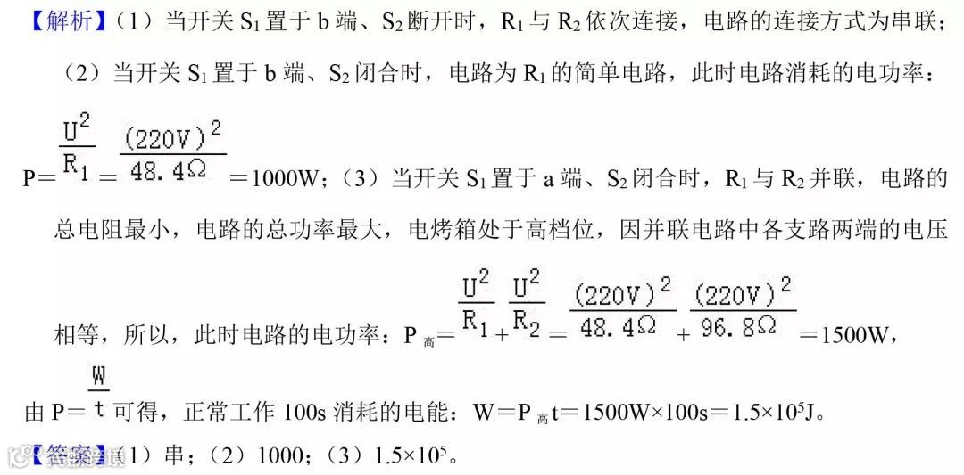 例题3(2018•西宁)小明家买了一台电烤箱,有低、中,高三个档位的发热功率,如图是其内部简化电路图,开关S1可分别与接触点a、b接触。(已知;R1=48.4Ω,R2=96.8Ω,且电源电压保持不变)