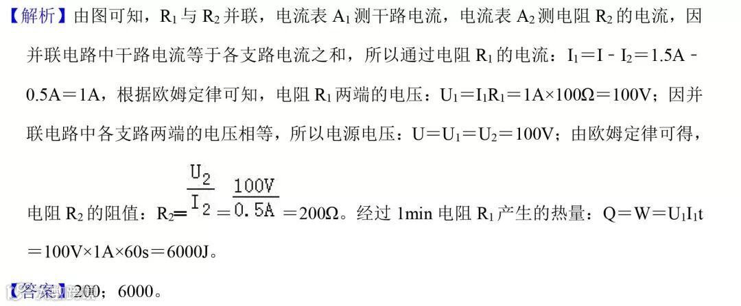 例题2(2018•日照)如图,已知R1的阻值为100Ω,电流表A1、A2示数分别为1.5A、0.5A,则R2=________Ω,经过1min电阻R1产生的热量为________J。