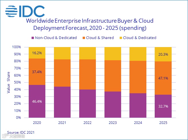 尽管第二季度表现疲软,IDC 预测 2021 年云基础设施支出将增长 12%,达到743亿美元。非云基础设施在两年下滑后预计将增长2.7%,达到589亿美元。全年共享云基础设施预计将同比增长11.1%,达到514亿美元。预计全年专用云基础设施支出将增长14.1%,达到228亿美元。